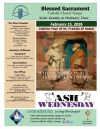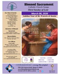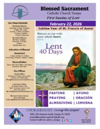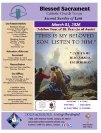 Check out our Bulletin! Weekly Meditations, Announcements, Events, and More. Third Sunday of Lent March 08, 2026 Fourth Sunday in Ordinary Time March 01, 2026 First Sunday of Lent February 22, 2026 Sixth Sunday in Ordinary Time February 15, 2026 Support our Mission Online Giving Catholic Ministries Appeal Give Connect with Us Facebook-f Twitter Youtube Resources for our Community For Your SoulThe Lord is with you always. Be guided by His Word. MinistriesSpread Love and Evangelize the Gospel of the Lord. Food PantryMondays & Wednesdays from 9:00am to 10:00am Garage SaleEvery Wednesday from 8:00am to 11:00am MASS TIMES & OFFICE HOURS Please join us! We are currently having Daily Liturgy Masses at regular scheduled hours. For Weekday Masses join us online through our Facebook page. Parish Office HoursMondays through Fridays: 9:00am to 5:00pm Weekend MassesSaturday 4:30pm (English)Sunday 7:45pm (Spanish)Sunday 10:00am (English)12:00pm (Spanish) Daily Masses 8:30am: Monday, Tuesday, Thursday, Friday, & Saturday7:00pm: WednesdayIf you are in need of the Sacrament of Reconciliation, please call the office to make arrangements